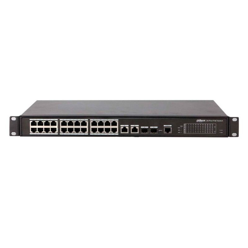 Dahua DH-PFS4226-24ET-360 - Управляемый коммутатор с функционалом уровня L2+ оборудован четырьмя гигабитными комбинированными портами (2 BASE-T и 2 Base-X) и 24 RJ-45 с поддержкой РоЕ (Fast Ethernet, Base-T), из них у двух (помечены оранжевым цветом) расширенный бюджет PoE (60 Вт) — для подключения устройств, в том числе поворотных камер, с повышенным энергопотреблением.