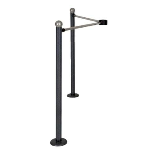 Комплект состоит из двух горизонтальных перемычек, двух стационарных хромированных стоек, которые соединены через разрезное кольцо с турникетом.