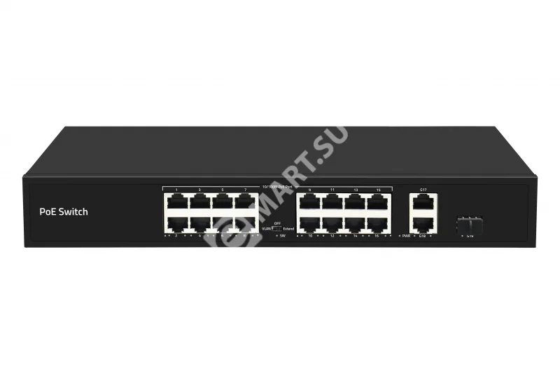 Неадминистрируемый коммутатор, 16 RJ-45 POE портов (10/100 Мбит/с), 2 RJ-45 Uplink порта (1000 Мбит/с), 1 SFP Uplink порт (1000 Мбит/с), бюджет на порт до 30 Вт, общий бюджет до 200 Вт.
