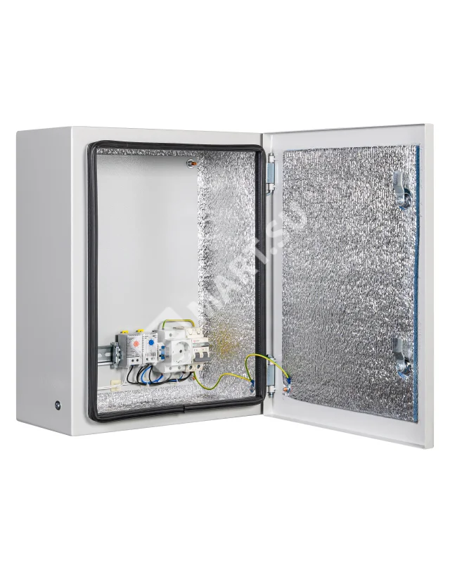 утеплитель из порилекса, замок 2 шт,ключ 1 шт, монтажная плата 1шт, гермовводы 2 шт (MG-25), розетка 1 шт, автоматический выключатель, 6А 1шт, клемма для подключения оборудования 2 шт, клемма заземления 1 шт, термореле 1шт, реле предстарта 1 шт, нагреватель мощностью 75 Вт 1шт.