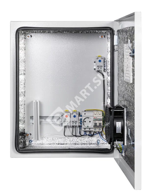 утеплитель из порилекса, замок 2 шт, ключ 1 шт, монтажная плата 1шт, гермовводы 2 шт (MG-25), розетка 1 шт, автоматический выключатель, 6А 1шт, клемма для подключения оборудования 2 шт, клемма заземления 1 шт, термореле 1шт, реле предстарта 1 шт, вентиляционная решётка с фильтром 1 шт, вентилятор с решёткой и фильтром 1 шт, нагреватель мощностью 100 Вт 1шт.
