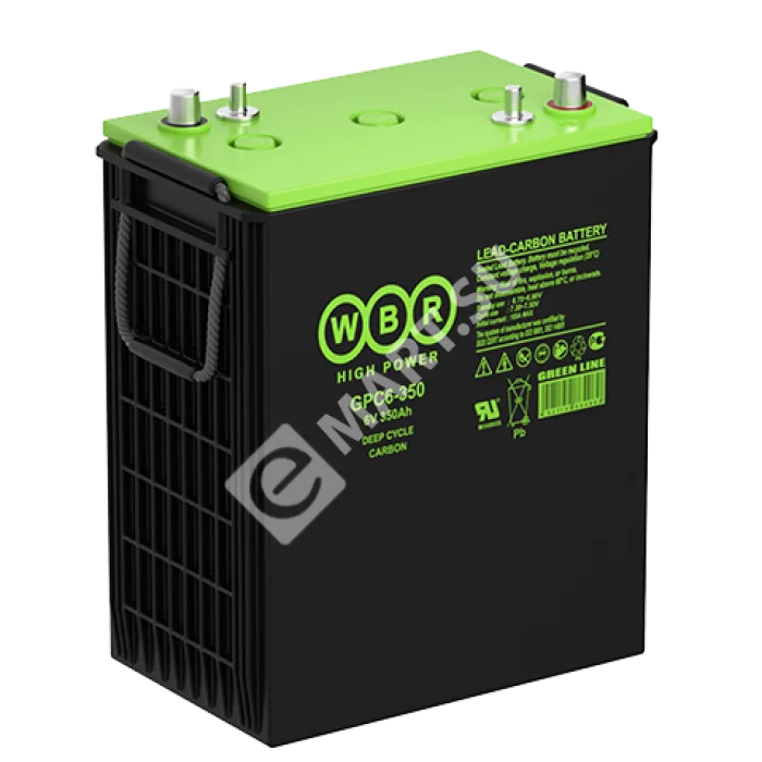 Аккумулятор WBR GPC6-350 - герметизированная, карбоновая, свинцово кислотная, аккумуляторная батарея со сроком службы 15 лет или более 1900 расчетных циклов заряда-разряда в циклическом режиме при 70% разряде. Эта высокоэффективная, перезаряжаемая батарея не требует обслуживания в течение всего срока службы и за счет использования чистого свинца, а также добавки углерода в состав электродов получили улучшенные зарядные и разрядные характеристики.