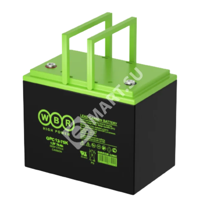 Аккумулятор WBR GPC12-75K - герметизированная, карбоновая, свинцово кислотная, аккумуляторная батарея со сроком службы 15 лет или более 1900 расчетных циклов заряда-разряда в циклическом режиме при 70% разряде. Эта высокоэффективная, перезаряжаемая батарея не требует обслуживания в течение всего срока службы и за счет использования чистого свинца, а также добавки углерода в состав электродов получили улучшенные зарядные и разрядные характеристики.