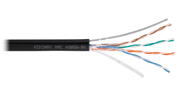 Кабель NIKOMAX U/UTP 4 пары, Кат.5e (Класс D), тест по ISO/IEC, 100МГц, одножильный, BC (чистая медь), 24AWG (0,51мм), полиэтилен, внешний, с многожильным тросом (1,25мм), черный, 500м - гарантия: 3 года