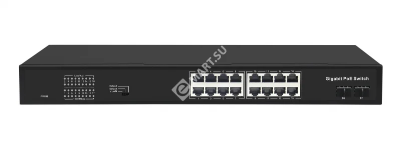 Неуправляемый коммутатор PoE NIKOMAX, 16*10/100/1000 Мбит/с PoE (802.3af/at), 9-16 порт до 250 метров cat6, 2*1000 Мбит/с SFP, VLAN, 300Вт