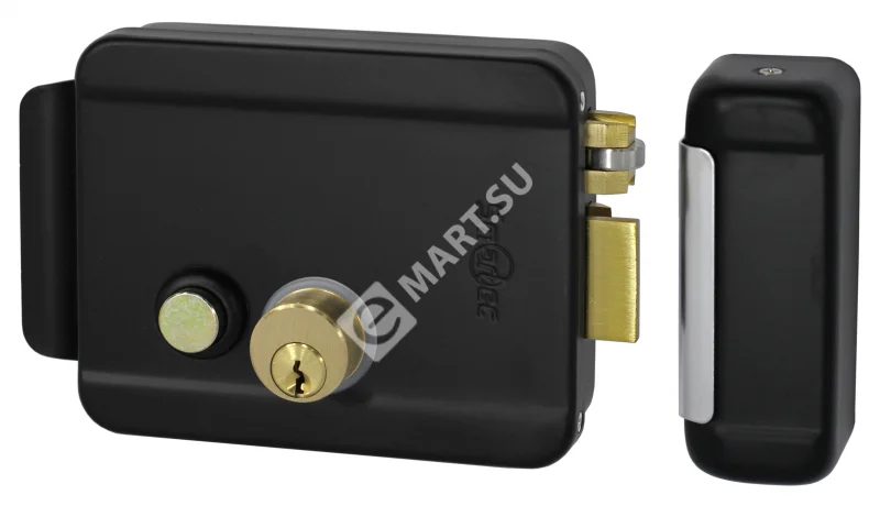 Эл-мех. накладной замок, черный, НЗ, универсальный DIN, цилинр снаружи и изнутри, кнопка изнутри (блокировка кнопки), питание 12VDC/1А, -40°+50°С, окрашенная сталь.