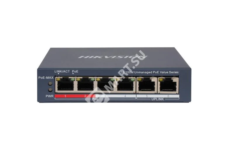 Компактный PoE-коммутатор Hikvision DS-3E0106P-E/M(B) с 4 портами PoE, 2 uplink портами и увеличенной дальностью до 300 м